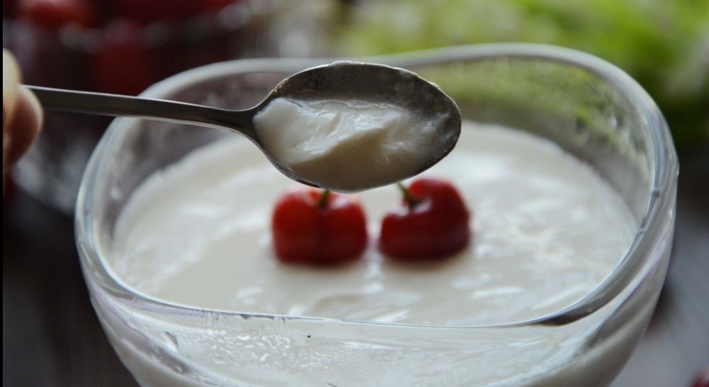 2)倒入原味酸奶,用勺子攪拌均勻。
